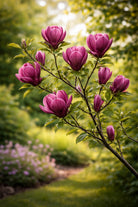 Magnolie, opstammet med elegant stamme og afrundet krone. Store, mørkerøde næsten sorte blomster pryder træet i foråret, før løvet folder sig ud, hvilket giver et imponerende dekorativt fokuspunkt. Bladene er mørkegrønne og læderagtige, og træet fungerer som solitær i haver, hvor blomsterne kan træde tydeligt frem.